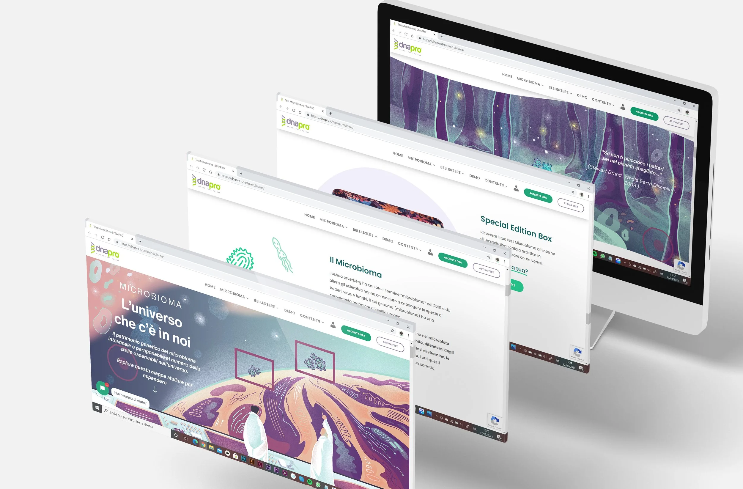 DnaPro Group is a company that carries out tests on people's health, in detail it carries out research and experimentation in the field of the "microbiome". The most recent research identifies the microbiome as a new organ capable of developing immunity, defending against pathogens, regulating metabolism, vitamin synthesis, fat reserves and influencing behavior. Through the test, pathologies and disorders can be prevented. The mood of the site takes inspiration from a journey into an imaginary universe, made up of microorganisms, bacteria, viruses, etc.